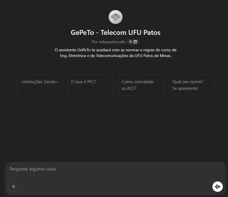 O curso de Engenharia Eletrônica e de Telecomunicações do campus Patos de Minas lançou hoje uma versão modificada do ChatGPT alimentado com as normas e regras de graduação e específicas do curso. O projeto é uma iniciativa da coordenação do curso aliado ao Programa de Extensão RoboPatos.