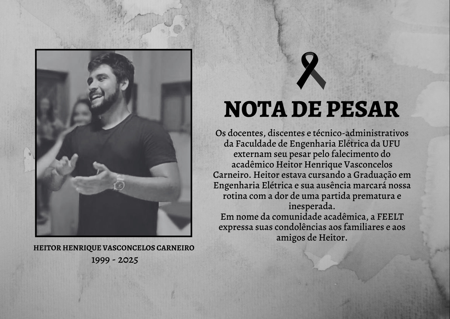 Os docentes, discentes e técnico-administrativos da Faculdade de Engenharia Elétrica da UFU externam seu pesar pelo falecimento do acadêmico Heitor Henrique Vasconcelos Carneiro. Heitor estava cursando a Graduação em Engenharia Elétrica e sua ausência marcará nossa rotina com a dor de uma partida prematura e inesperada. Em nome da comunidade acadêmica, a FEELT expressa suas condolências aos familiares e a amigos de Heitor.